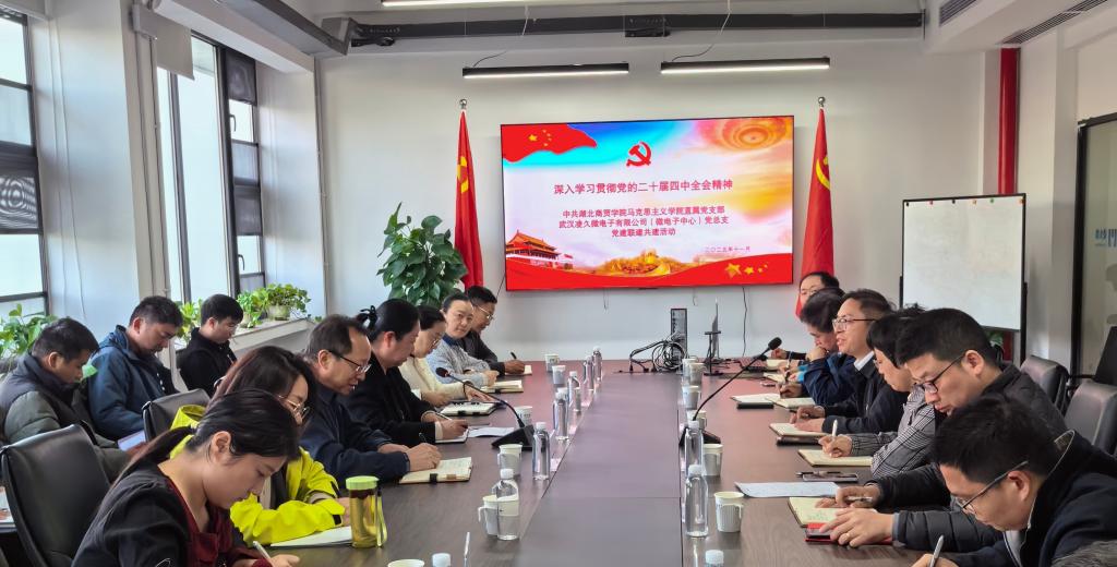 为深入学习贯彻党的二十届四中全会精神,充分发挥高校马克思主义学院思想政治教育优势与高科技企业科技创新资源优势,2025年11月28日下午,湖北商贸学院马克思主义学院直属党支部与中船709所武汉凌久微电子有限公司党总支联合开展“思政铸魂・科技赋能・协同奋进”主题党日共建活动。双方党员代表、马院教师骨干约60人参与活动,通过理论共学、实践互鉴等形式取得了良好成效。
